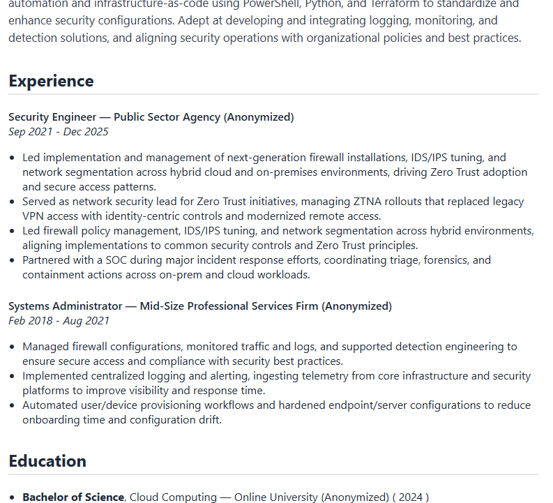 I wish. I’m mainly looking for jobs in infosec since that’s what I’ve been doing the past several years, while my previous roles were more generalist sysadmin and help desk. If I only look for jobs that are aligned with one of my roles, the genius LLM only returns bullets from one role, and that’s going to look really odd to a hiring manager. It looked even more odd to have 11 bullets for one role and then only one bullet for another! This turned into quite the problem – I tried to fix it with AI but trying to force it to use a specific amount of data from specific roles really degraded its ability to make good bullets, so I went old-school to fix the issue.